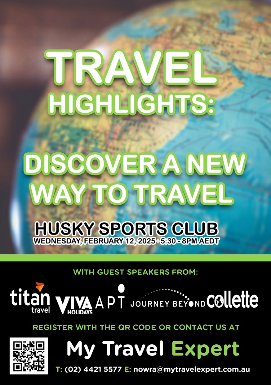 If you haven’t heard the news, My Travel Expert & The Shoalhaven Solo Sisters are hosting a Travel Information evening at Husky Sports Club on the 12th February 2025, doors open at 5:30 for a 6pm start and you are more than welcome to come along!