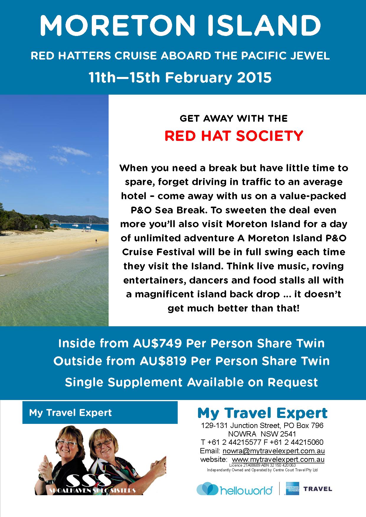 For those that have been considering joining the Red Hatters Cruise to Moreton Island we do have a single Lady looking to travel with someone – so if you were wary of a single cabin cost this is your opportunity to save! Just contact us for more details!