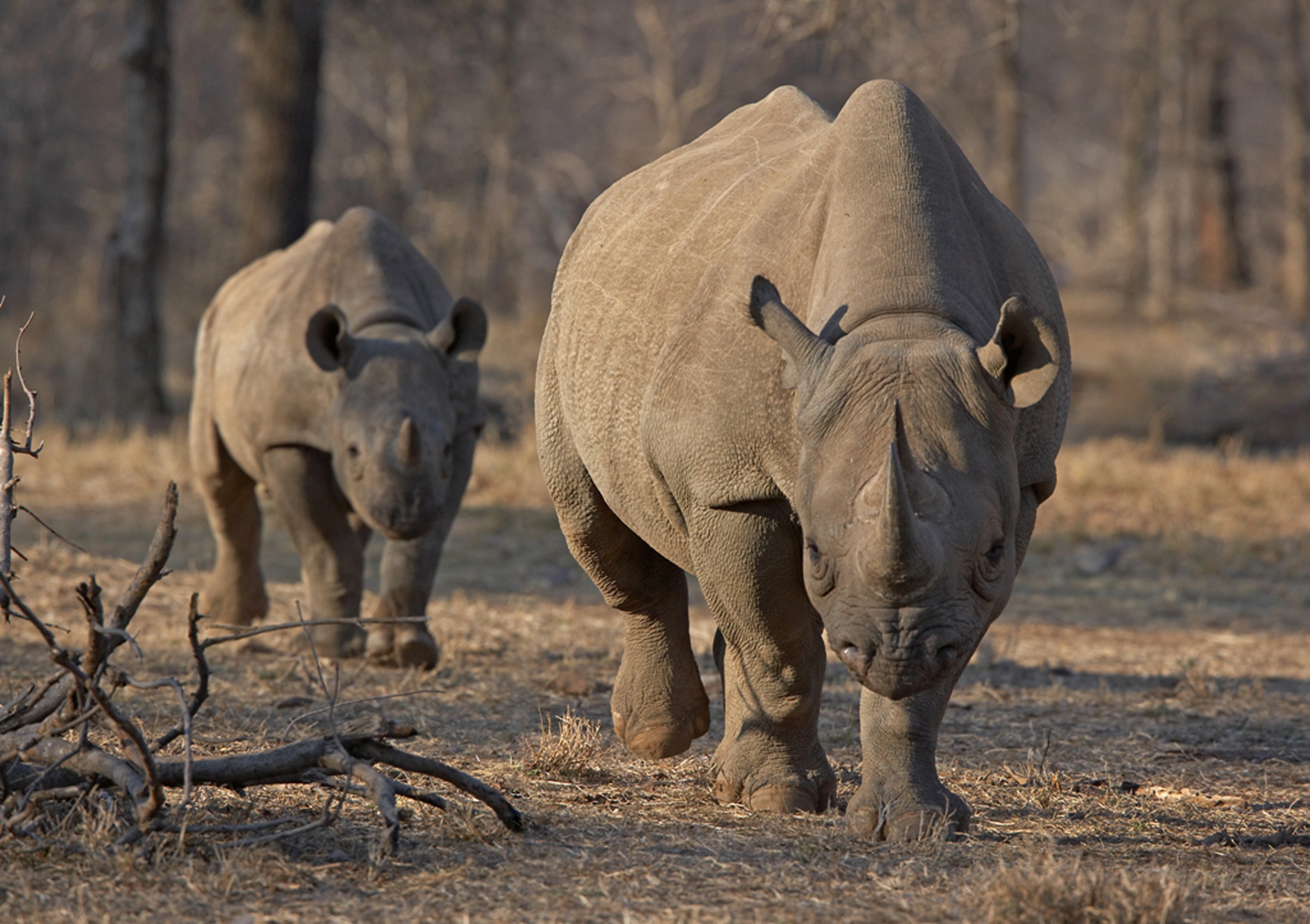 An endangered east African black rhinoceros and her calf walk in Tanzania’s Serengeti park in this file photo taken May 21, 2010. A permit to hunt a black rhino in Namibia sold for $350,000 at an auction in Dallas on Saturday with proceeds going to protect the endangered animals despite protests from animal rights groups that saw the sale as immoral conservation. REUTERS/Tom Kirkwood/Files (TANZANIA – Tags: ANIMALS ENVIRONMENT)